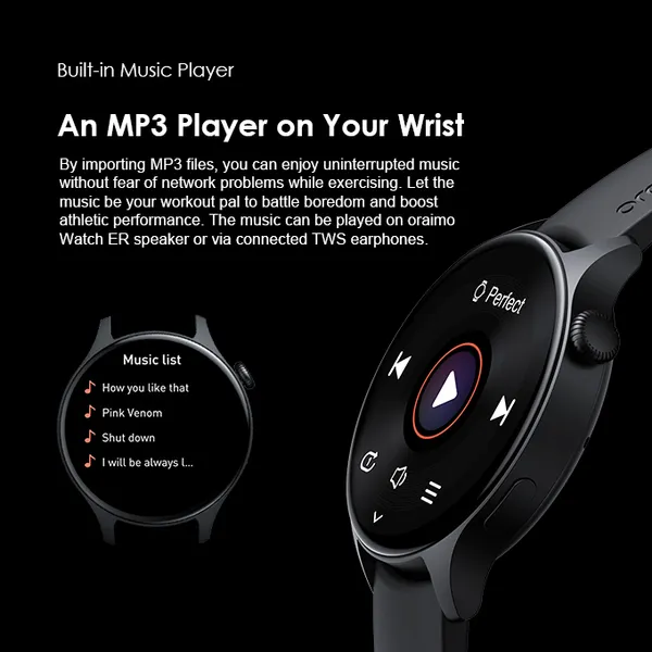 صُنعت ساعة Oraimo Watch ER من هيكل متين من مادة PC + ABS، وتتميز بخفة وزنها ومتانتها على المعصم. توفر شاشة AMOLED سطوعًا استثنائيًا وتباينًا عميقًا، مما يجعل الإشعارات وواجهات الساعة تظهر بشكل رائع.