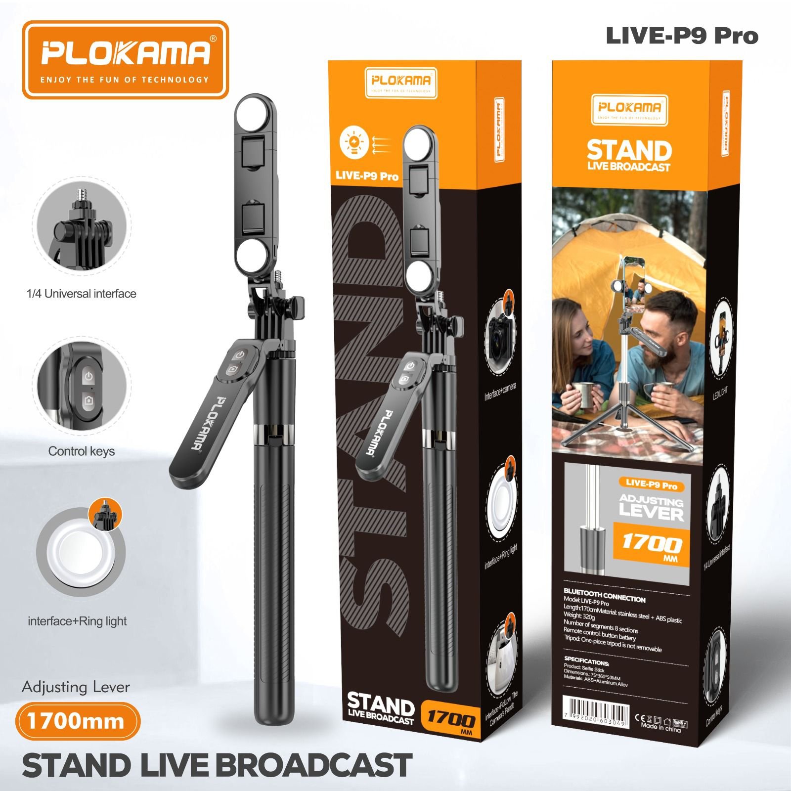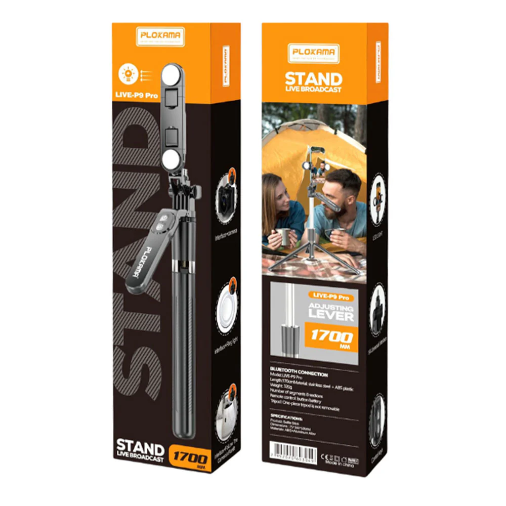 ستاند بث مباشر Plokama LIVE-P9 Pro بإضاءة LED وريموت بلوتوث – 170 سم
