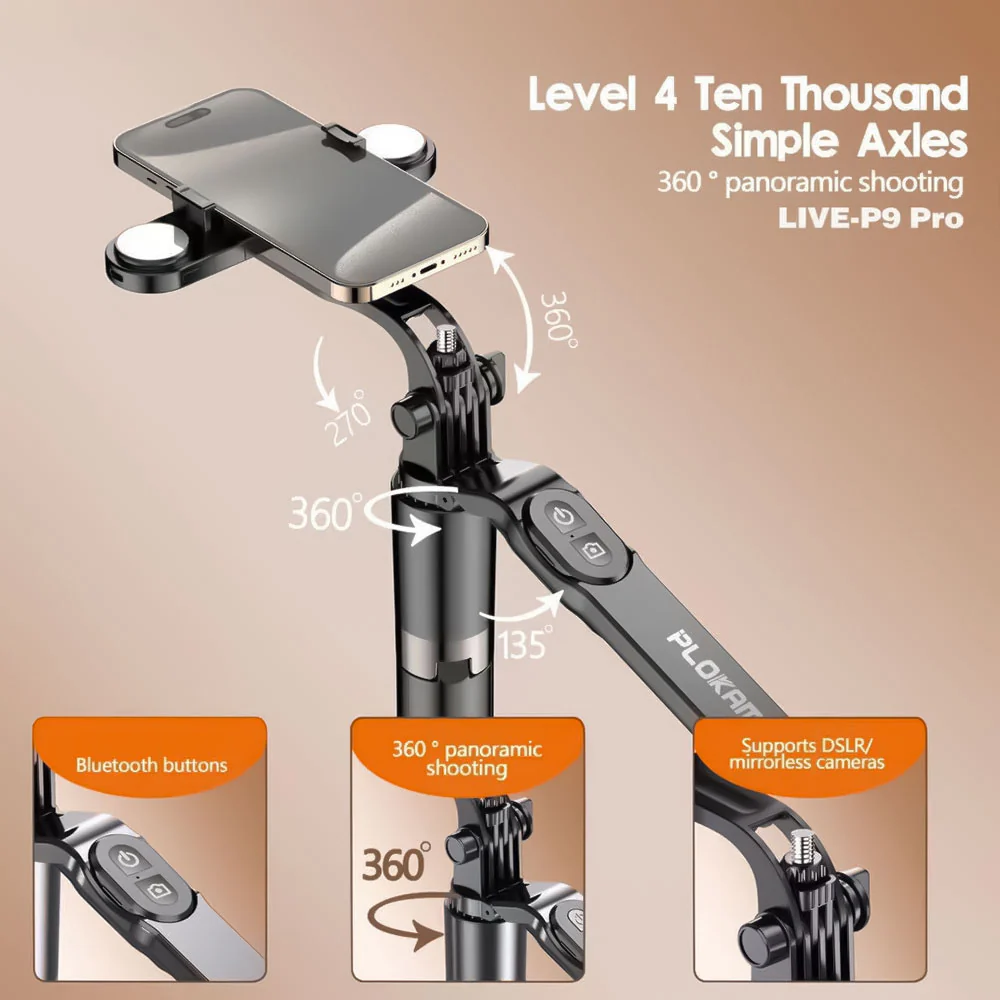 يحتوي Plokama LIVE-P9 Pro على حامل موبايل مرن وقابل للتدوير 360 درجة، مما يسمح بتصوير الفيديوهات أفقيًا أو رأسيًا بسهولة.