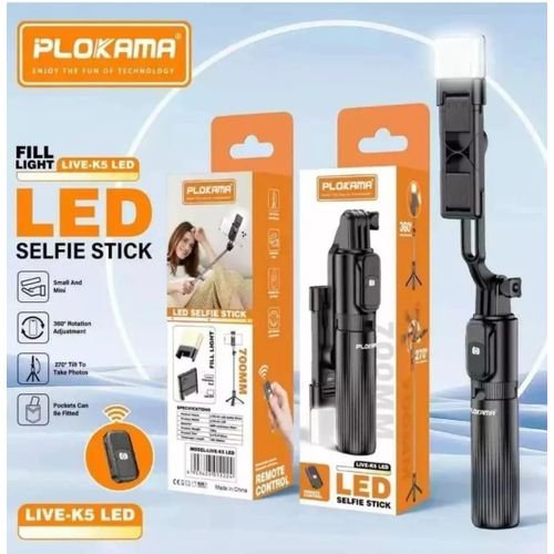 The Plokama LIVE-K5 is a compact LED selfie stick that converts into a tripod, featuring a detachable Bluetooth remote, adjustable fill light, and wide rotation angles. Designed for everyday photos, videos, and hands-free shooting.