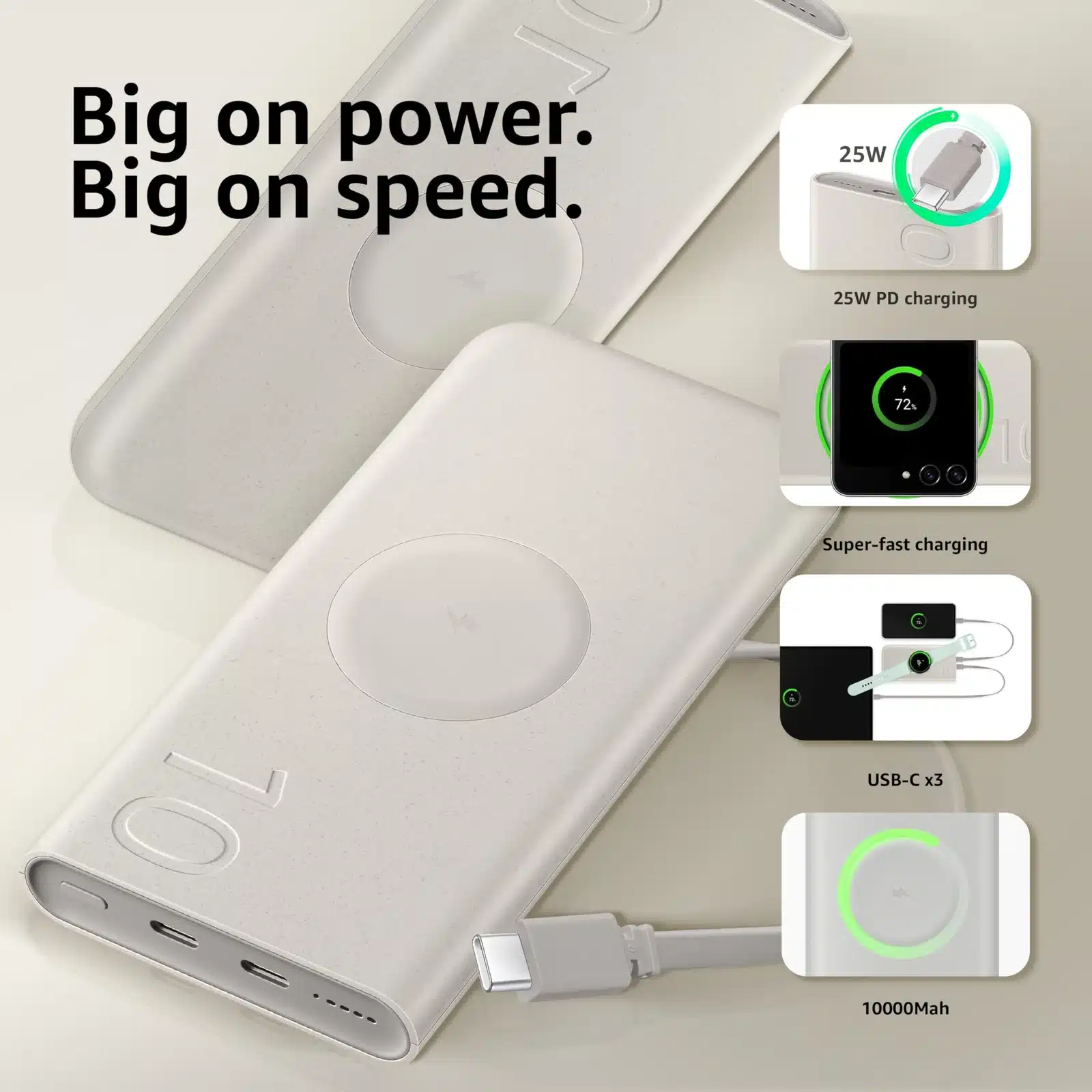 It offers 10000mAh capacity with 25W super fast charging and PD/PPS support.