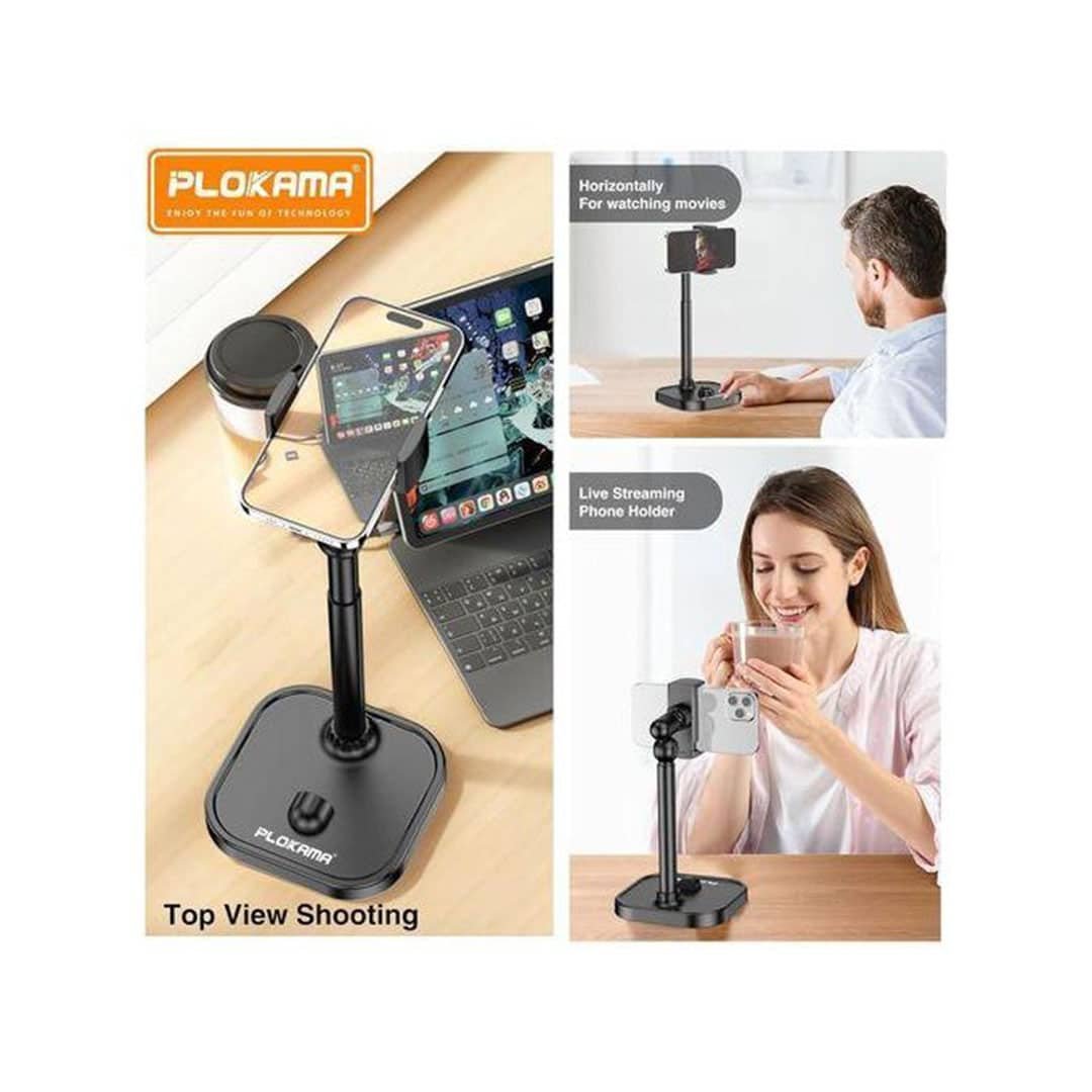 حامل موبايل مكتبي قابل للرفع PLOKAMA DT-80 – ارتفاع 22–37 سم ودوران 360° بقاعدة معدنية ثابتة